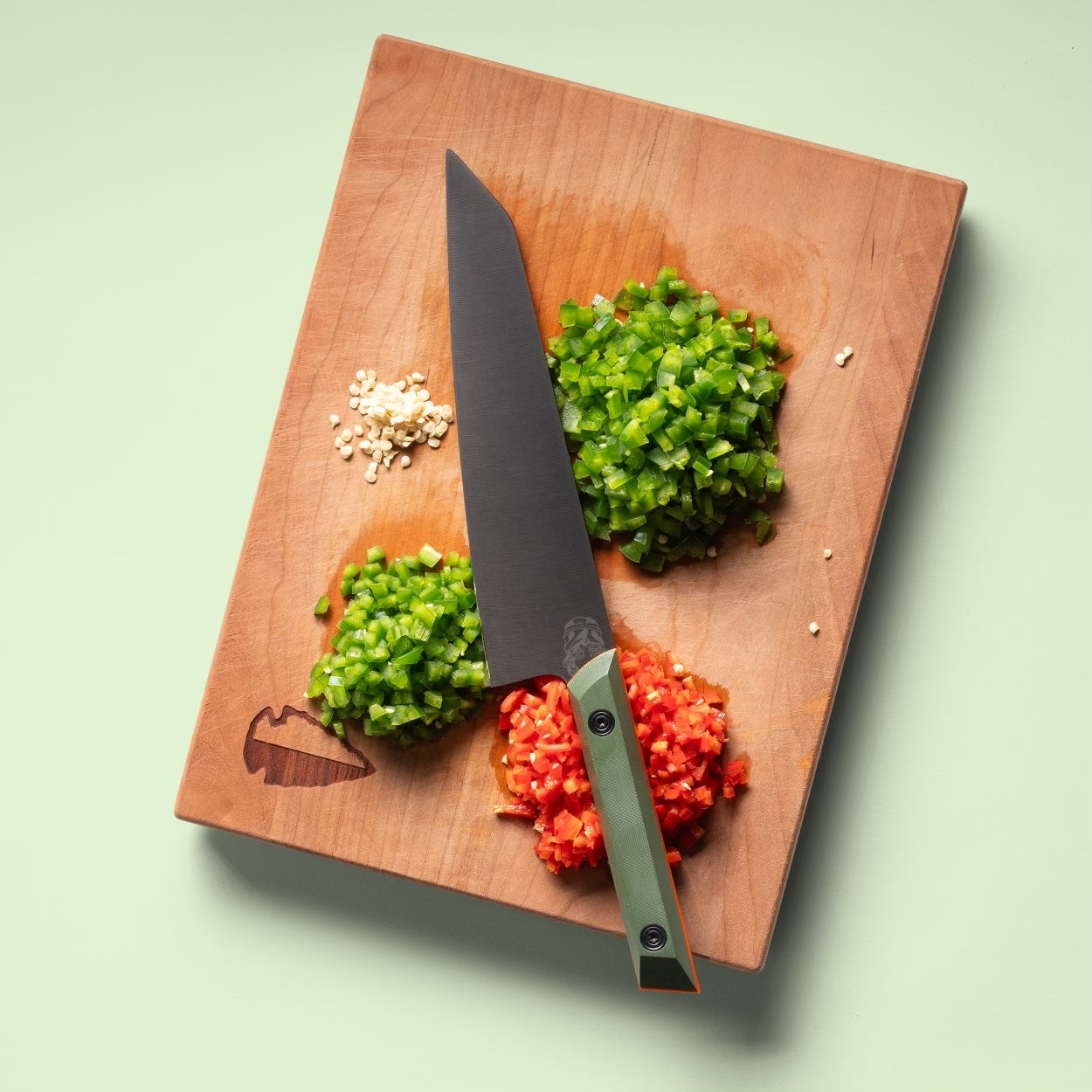 The WRMFZY Kitchen Knife Set is a four-piece collection developed in collaboration with the veteran-owned company WRMFZY. With over a decade of experience in designing knives for the tactical and outdoor industries, owner Cameron Toor set out to conquer the world of kitchen cutlery. Utilizing some of the finest Japanese high-carbon stainless steels and combining it with a Titanium coating, they created TITANOX™️—a lighter, sharper, and more moisture-resistant material that sets a new standard for kitchen cutlery.